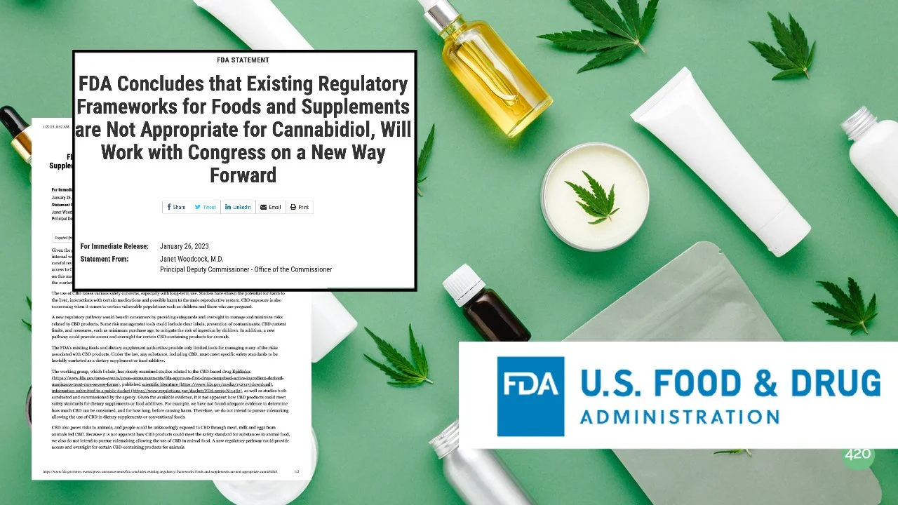 El jueves 26 de enero de 2023, la FDA publicó un comunicado en el que señala que dado el creciente mercado de productos de CBD se convocó a un grupo interno de trabajo para explorar las posibles vías para regular el cannabinoide.